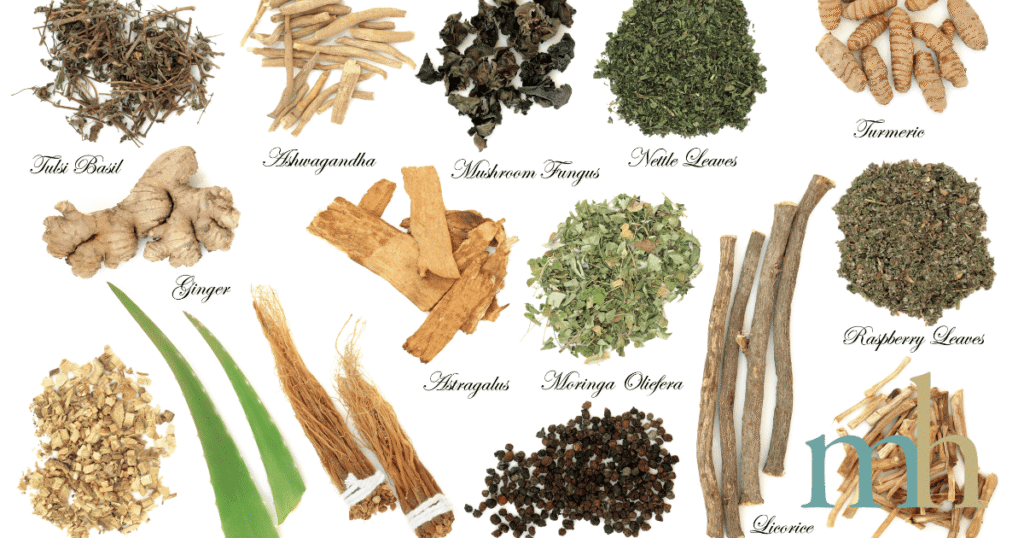 Adaptogenic herbs including ashwagandha, rhodiola rosea, and eleuthero are beneficial for stress management and adrenal health. They maintain cortisol balance, help the body cope with stress, and promote overall well-being.