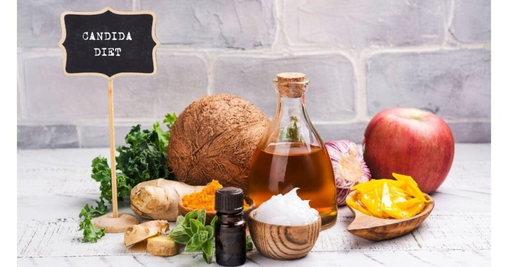 Apple cider vinegar and other ingredients on a table, with a focus on demystifying candida overgrowth from a functional medicine perspective.
