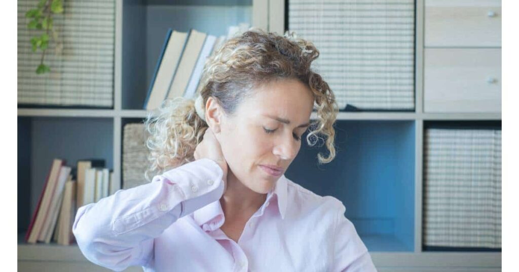 A woman is sitting at her desk with her hand on her neck, demystifying Candida Overgrowth.